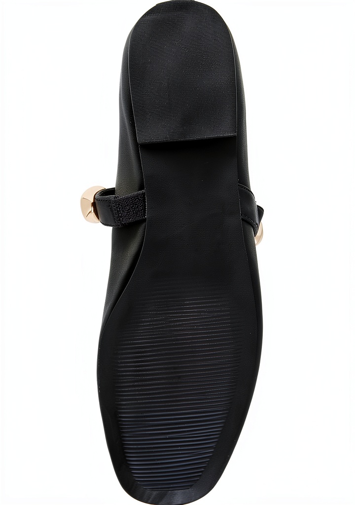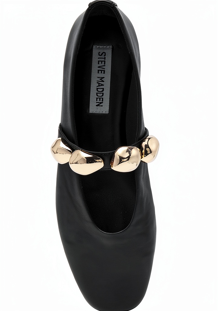 Steve Madden Poppin Ballet Flat in black leather on a neutral background