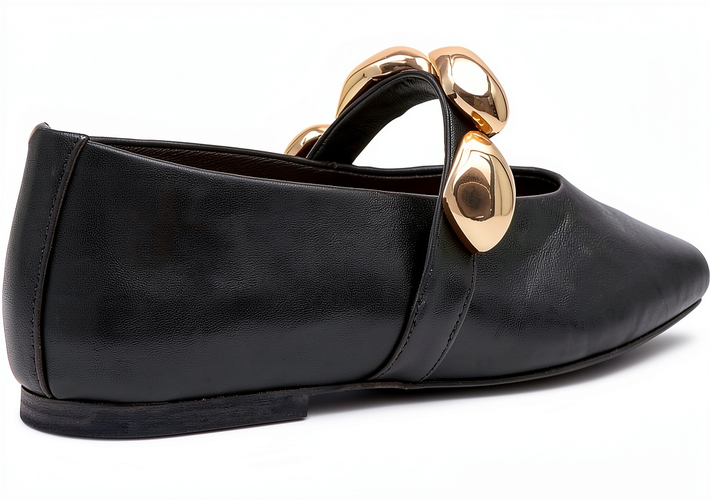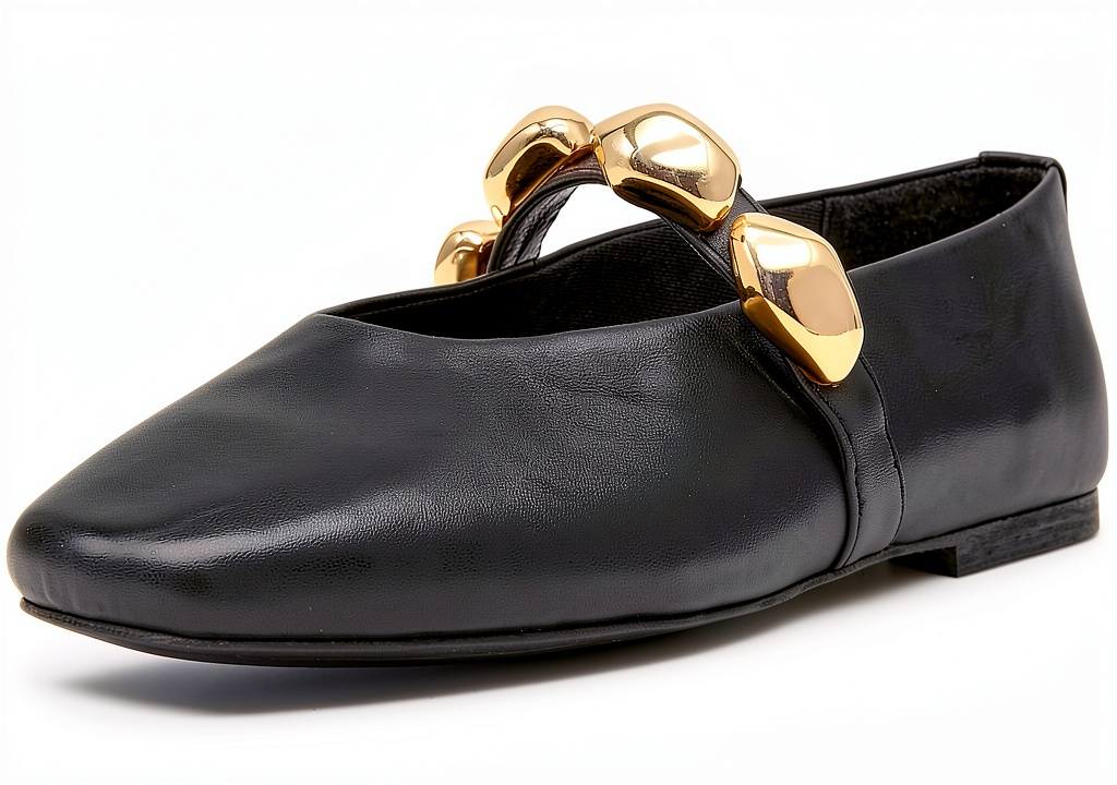 The flats are available in black leather and natural snake materials, both chosen for their softness, durability, and aesthetic appeal.